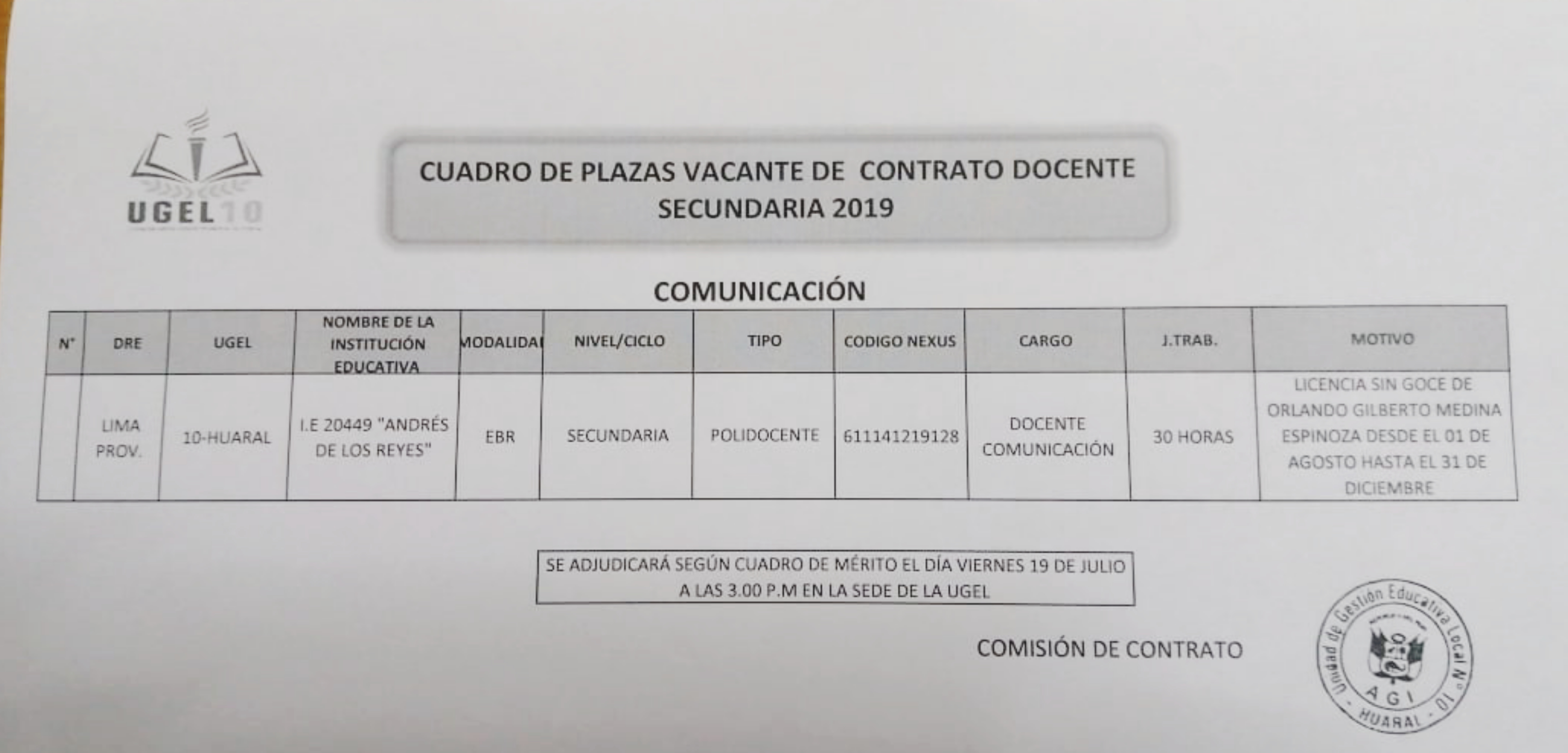 18 Jul,2019 Convocatorias COMMENTS Plaza Vacante Según Cuadro de Mérito de Contrato Docente - Comunicación
