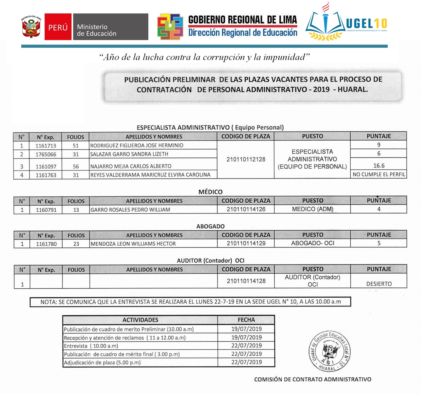 19 Jul,2019 Convocatorias COMMENTS Publicación Preliminar de las Plazas Para el Proceso de Contratación de Personal Administrativo.
