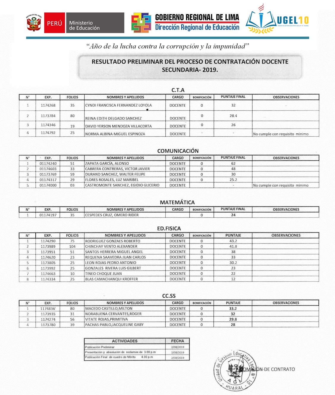 02 Ago,2019 Convocatorias COMMENTS Resultado Preliminar del Proceso de Contratación Docente Secundaria [C.T.A-Comunicación-Matemática-Educ. Física-CC.SS]