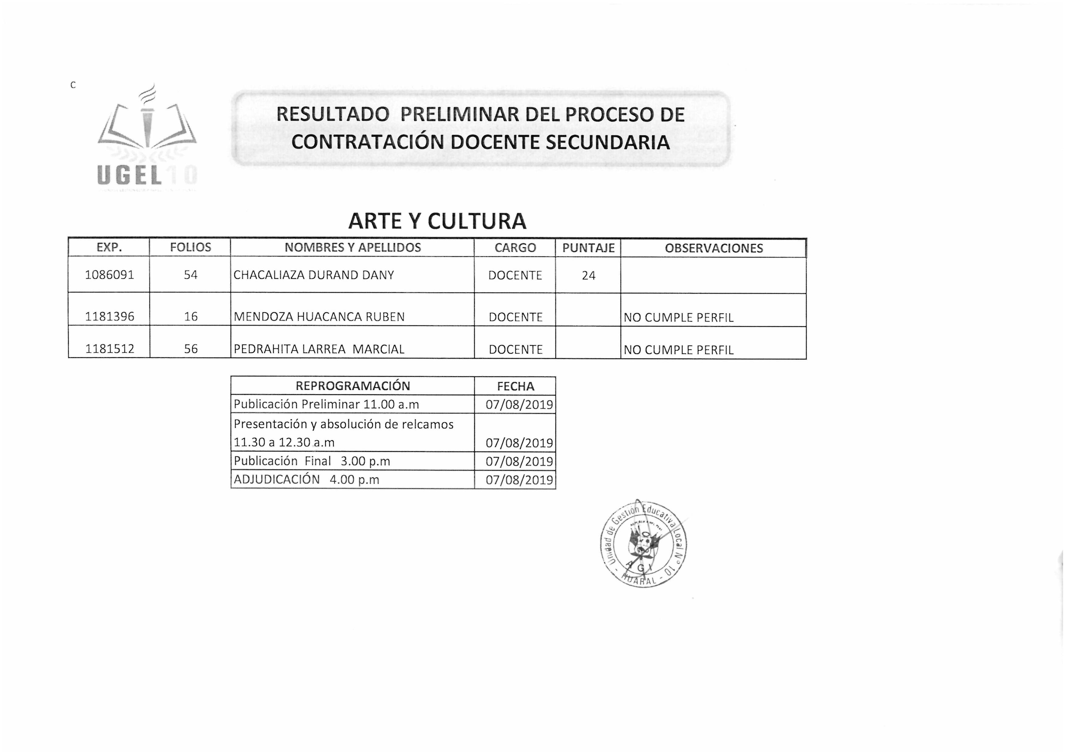 07 Ago,2019 Convocatorias COMMENTS RESULTADO PRELIMINAR DEL PROCESO DE CONTRATACIÓN DOCENTE SECUNDARIA "ARTE Y CULTURA"