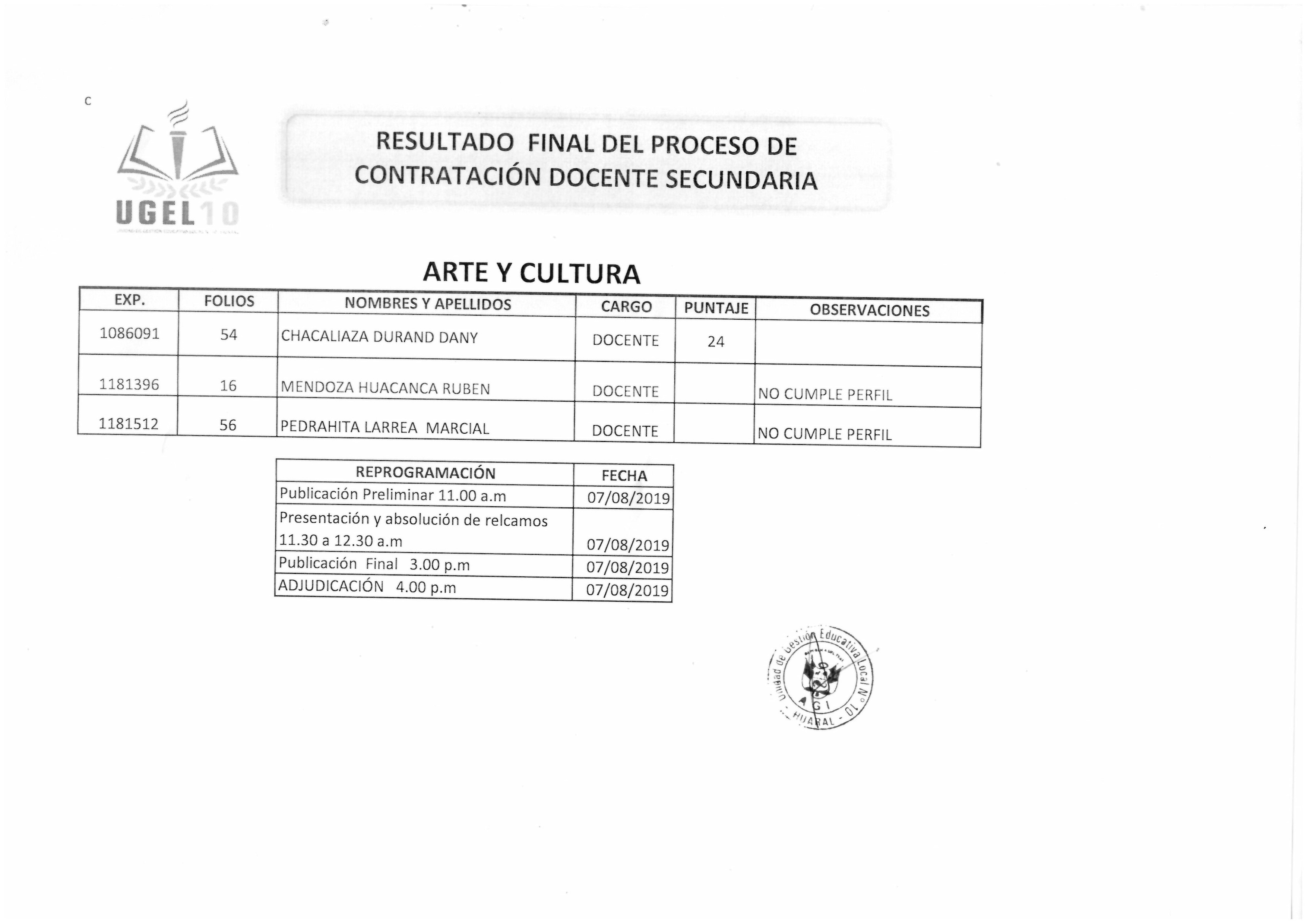 07 Ago,2019 Convocatorias COMMENTS Resultado Final del Proceso de Contratación Docente Secundaria [arte y cultura]