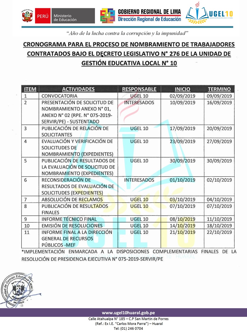 13 Ago,2019 Convocatorias COMMENTS Cronograma Para el Proceso de Nombramiento de Trabajadores Contratados Bajo el Decreto Legislativo N° 276 de la UGEL N° 10
