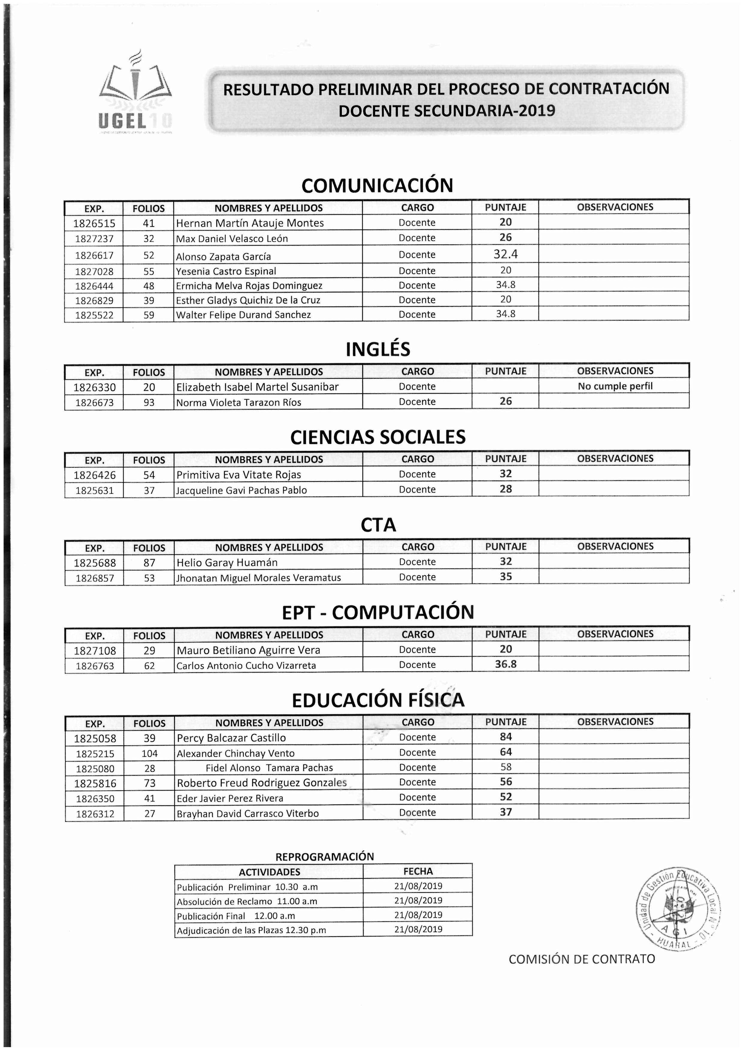 21 Ago,2019 Convocatorias COMMENTS RESULTADO PRELIMINAR DEL PROCESO DE CONTRATACIÓN DOCENTE SECUNDARIA - 2019