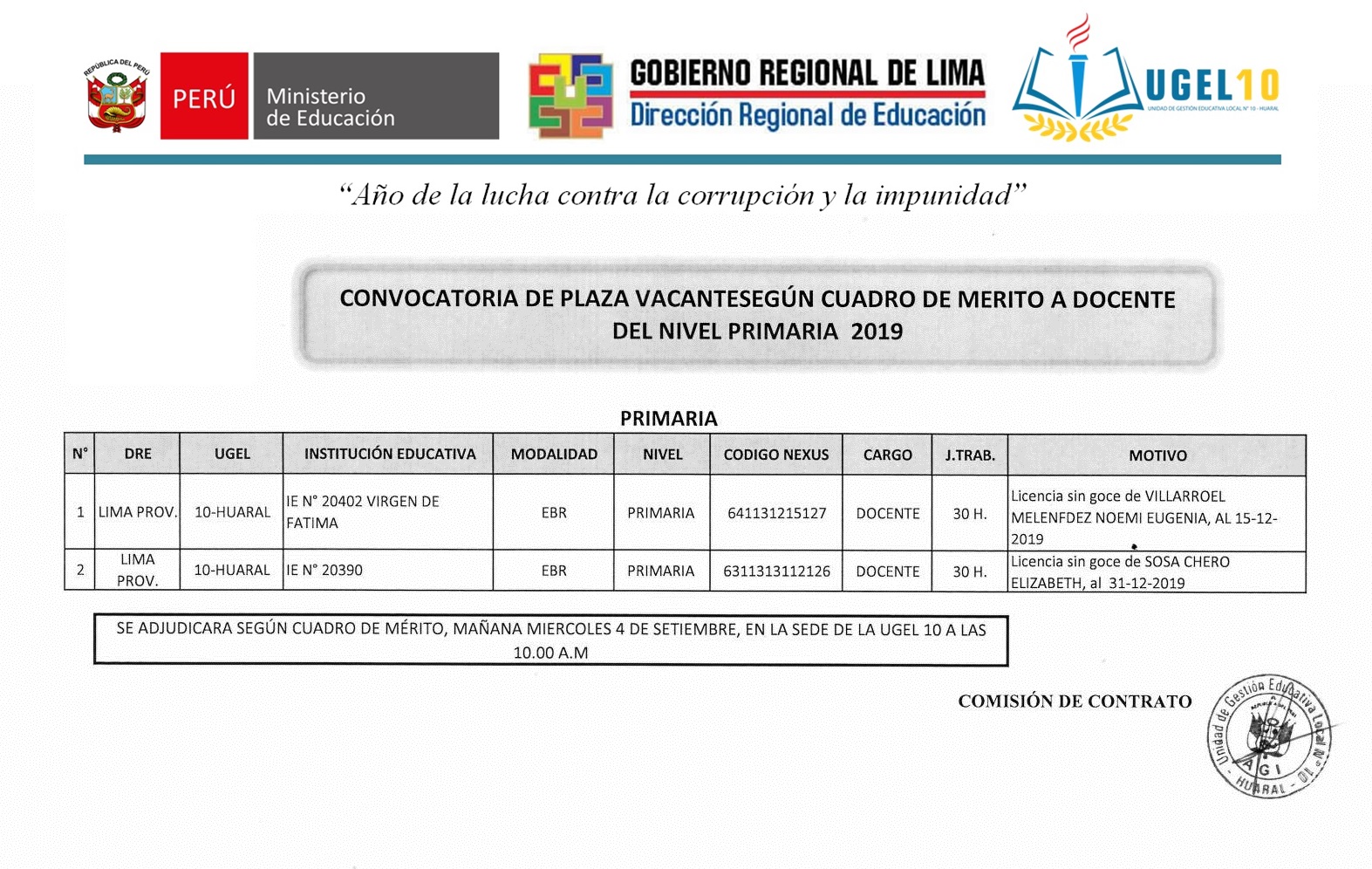 03 Sep,2019 Convocatorias COMMENTS Convocatoria de Plaza Vacante Según Cuadro de Mérito [Nivel Primaria]