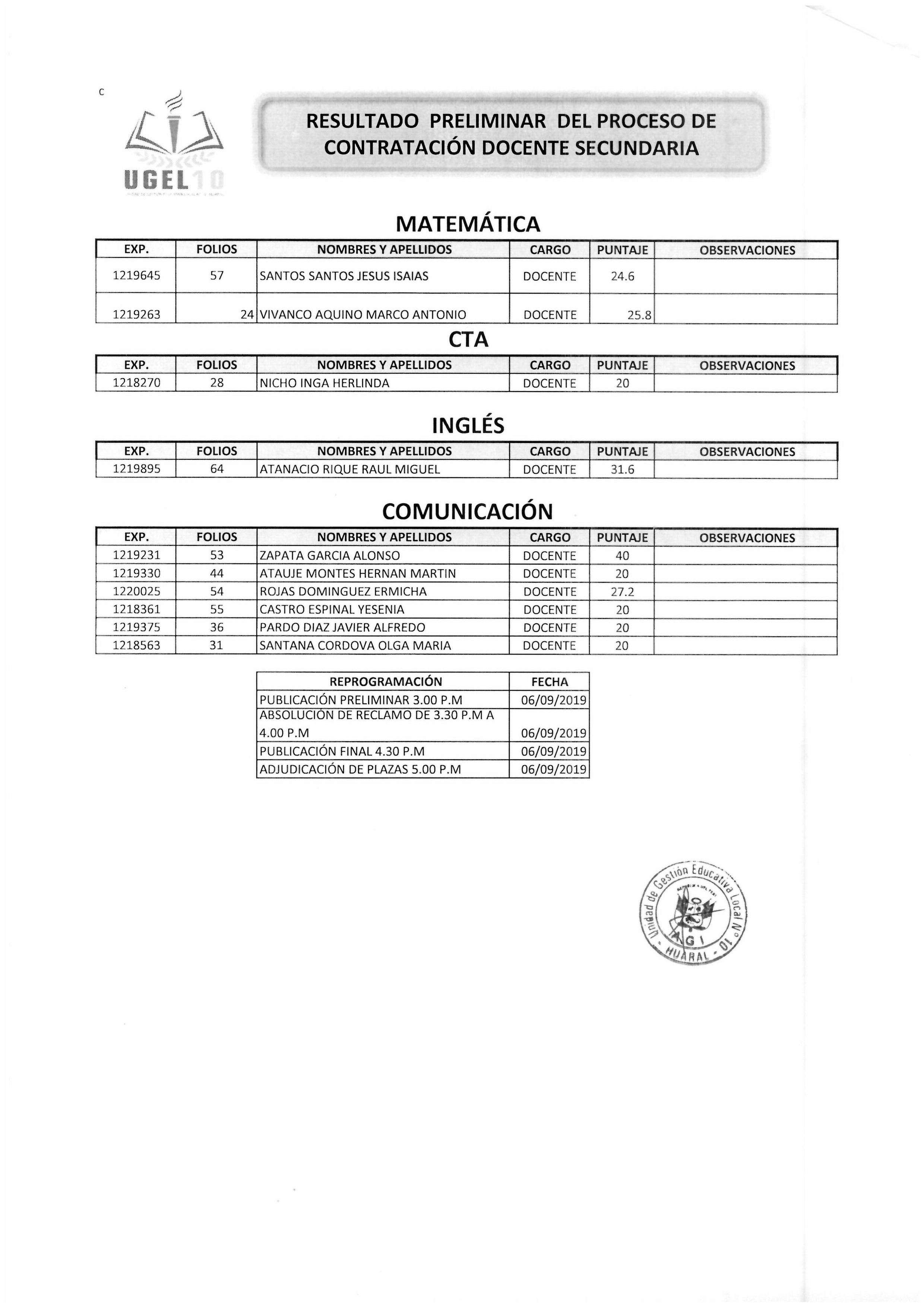06 Sep,2019 Convocatorias COMMENTS RESULTADO PRELIMINAR DEL PROCESO DE CONTRATACIÓN DOCENTE SECUNDARIA.