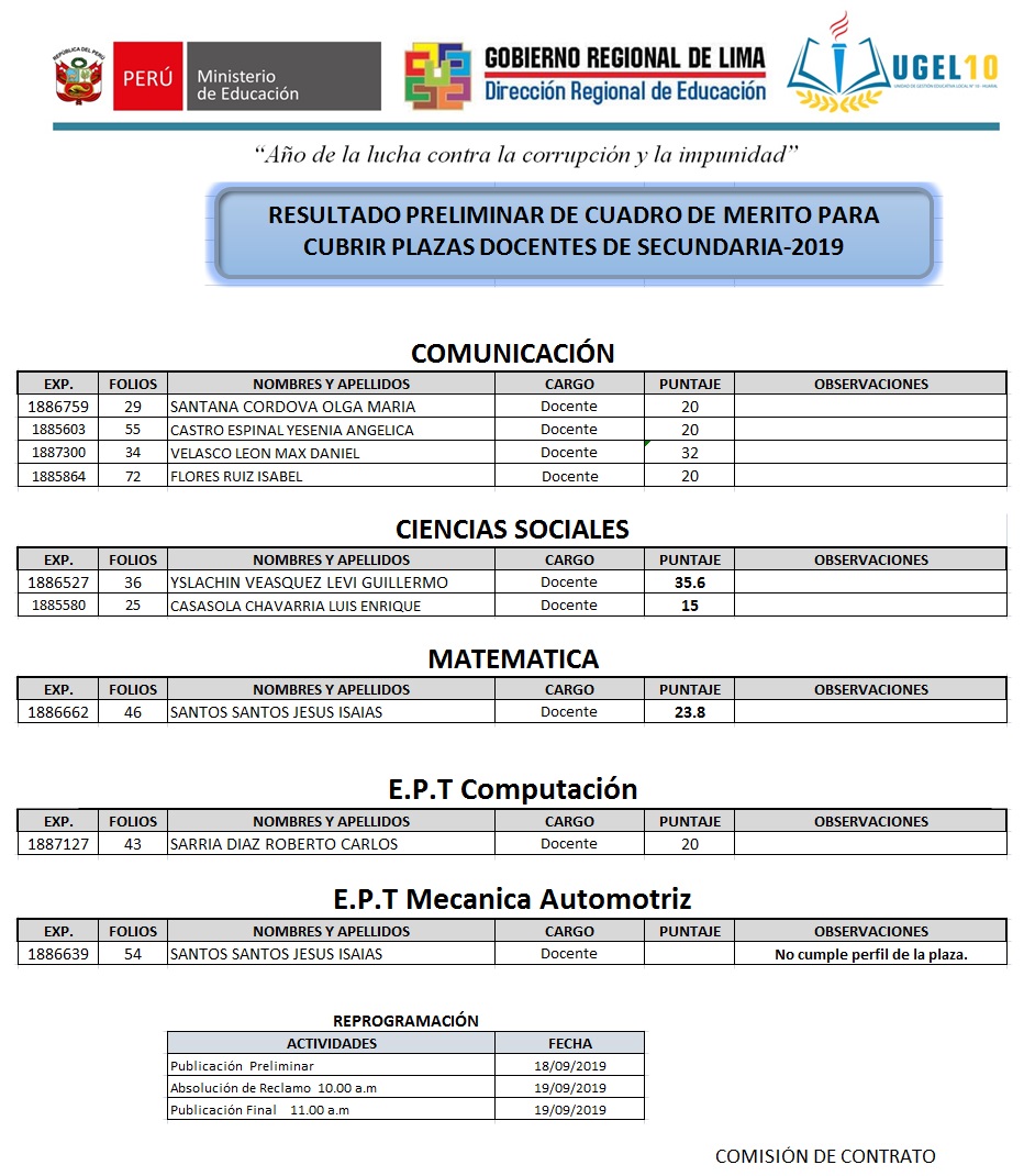 18 Sep,2019 Convocatorias COMMENTS Resultado Preliminar del Cuadro de Mérito Para Cubrir Plazas Docentes de Secundaria - 2019.