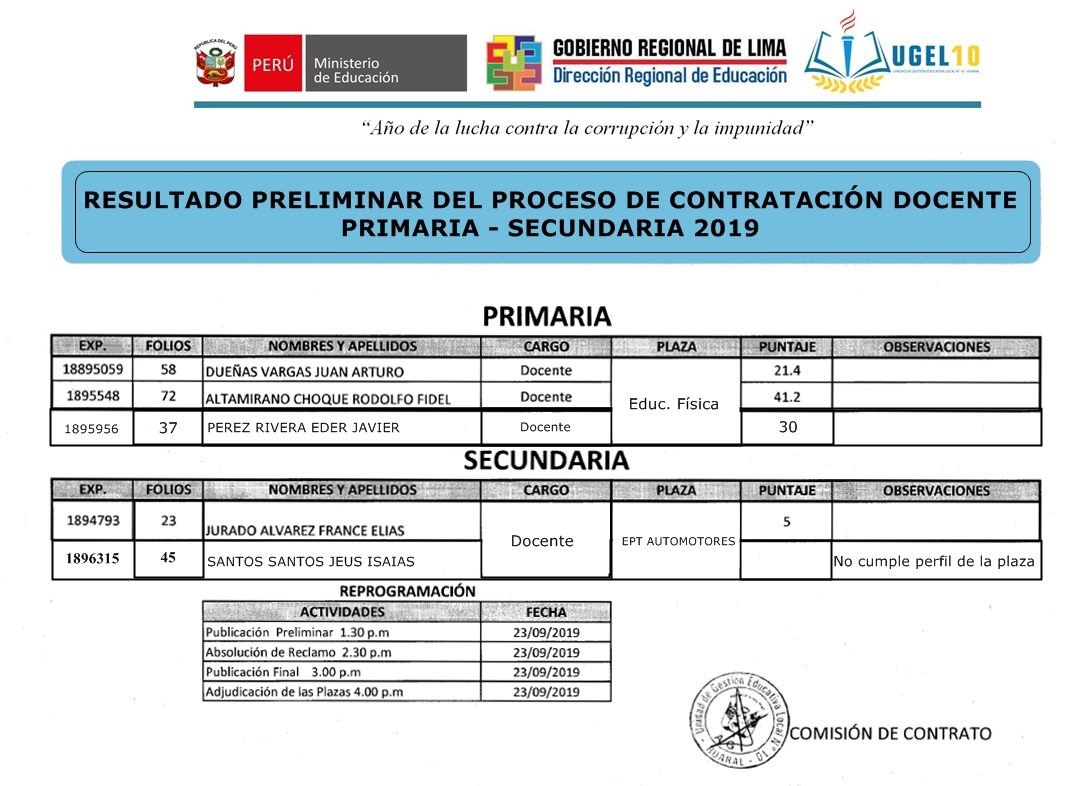 23 Sep,2019 Convocatorias COMMENTS Resultado Preliminar del Proceso de Contratación Docente [Primaria - Secundaria]