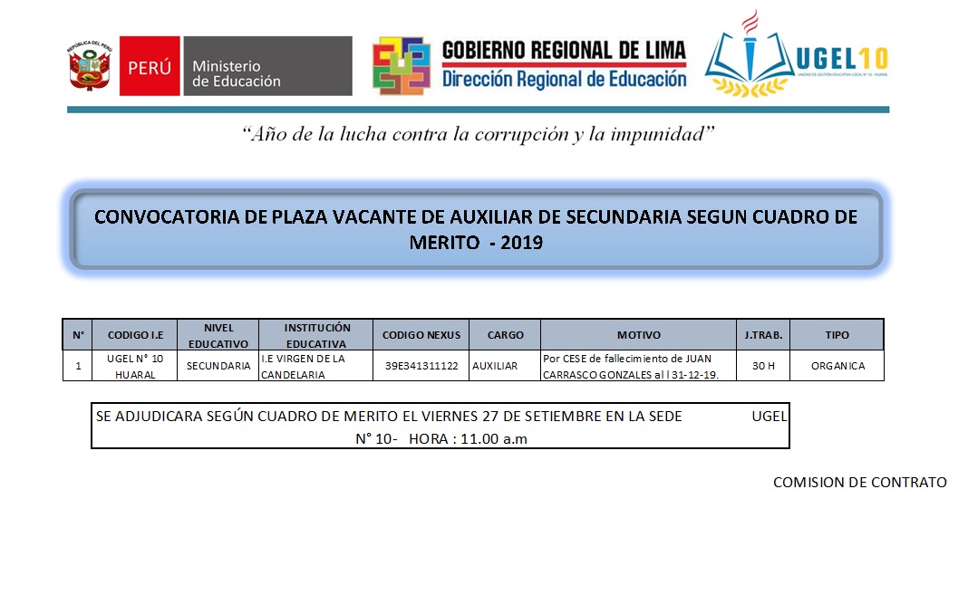 26 Sep,2019 Convocatorias COMMENTS Convocatoria de Plaza Vacante de Auxiliar de Secundaria Según Cuadro de Mérito 2019