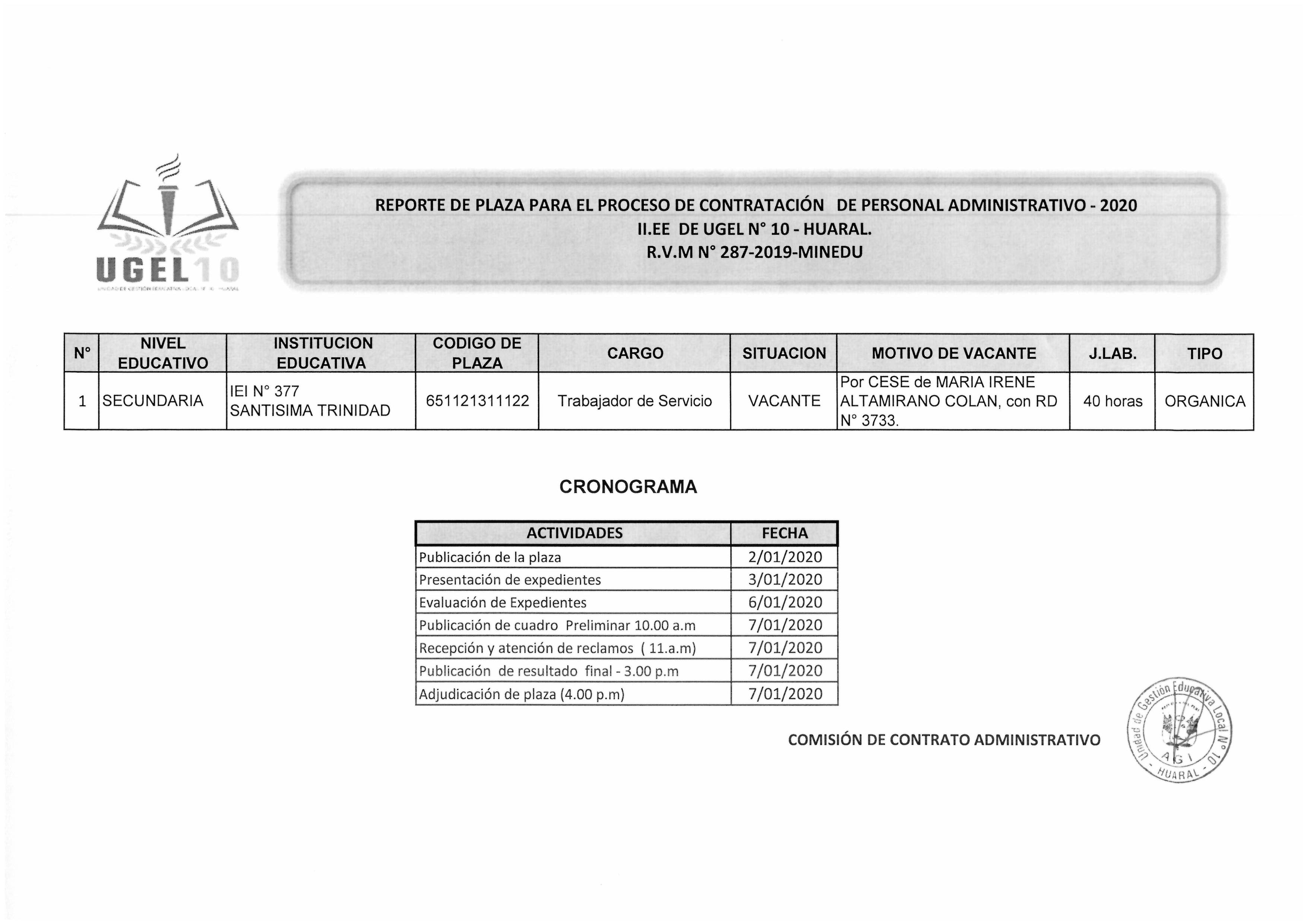 02 Ene,2020 Convocatorias COMMENTS REPORTE DE PLAZA PARA EL PROCESO DE CONTRATACIÓN DE PERSONAL ADMINISTRATIVO 2020 II.EE