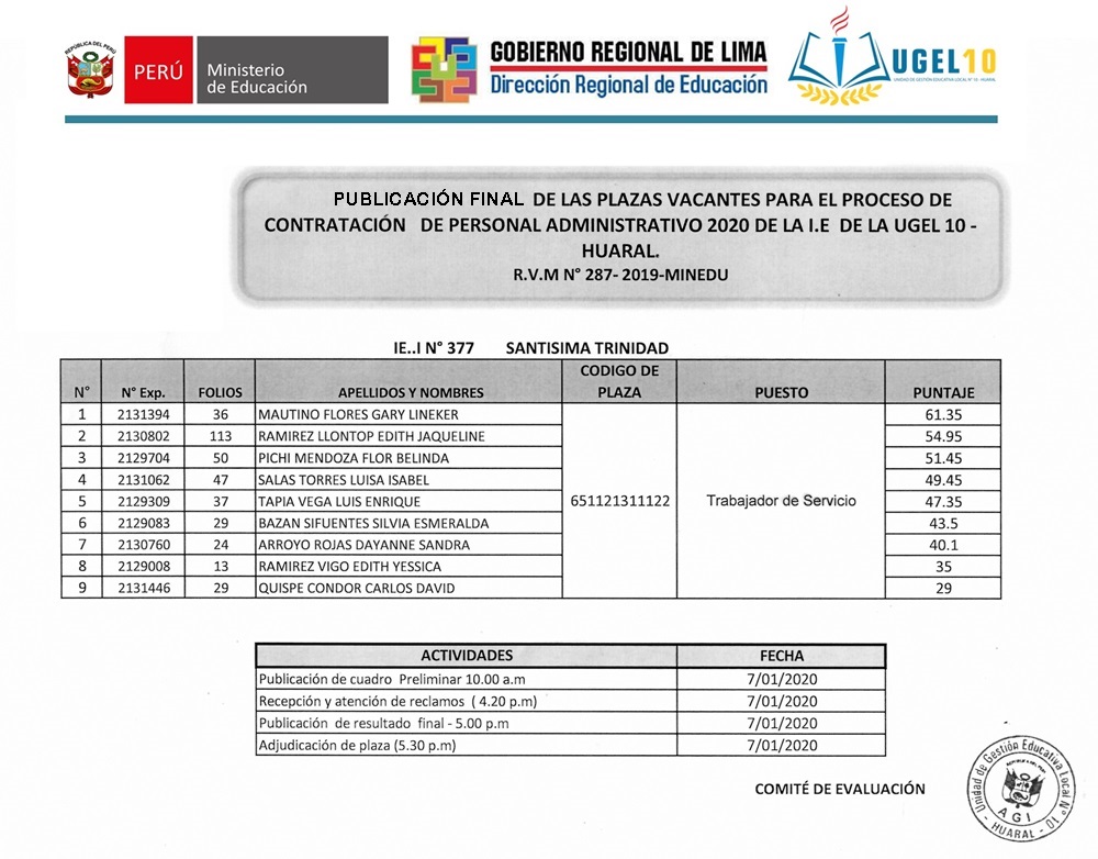 07 Ene,2020 Convocatorias COMMENTS Publicación Final de las Plazas Vacantes Para el Proceso de Contratación de Personal Administrativo 2020 de la I.E I N°377