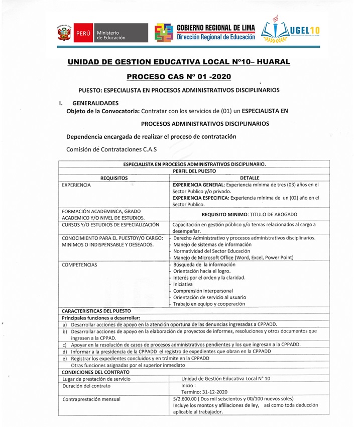 07 Ene,2020 Convocatorias COMMENTS CAS 01 - Convocatoria de Especialista en Procesos Administrativos Disciplinarios.