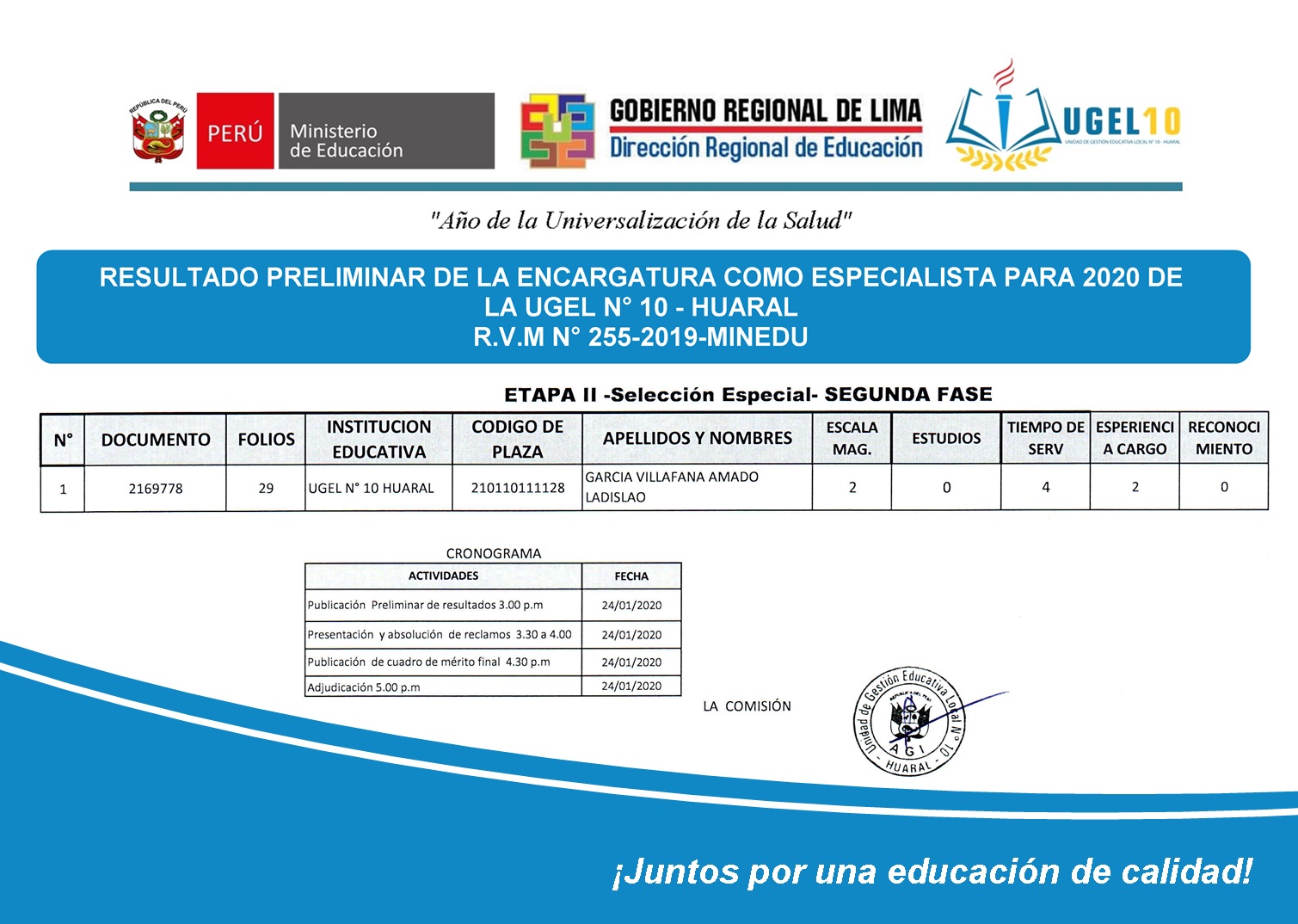 24 Ene,2020 Convocatorias COMMENTS Resultado Preliminar de la Encargatura Como Especialista Para 2020 de la UGEL N° 10.