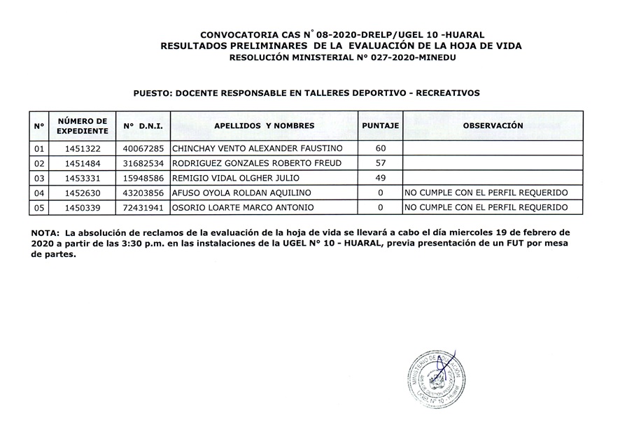 18 Feb,2020 Convocatorias COMMENTS CAS 08 Talleres Deportivos - Resultado Preliminar de la Evaluación de la Hoja de Vida
