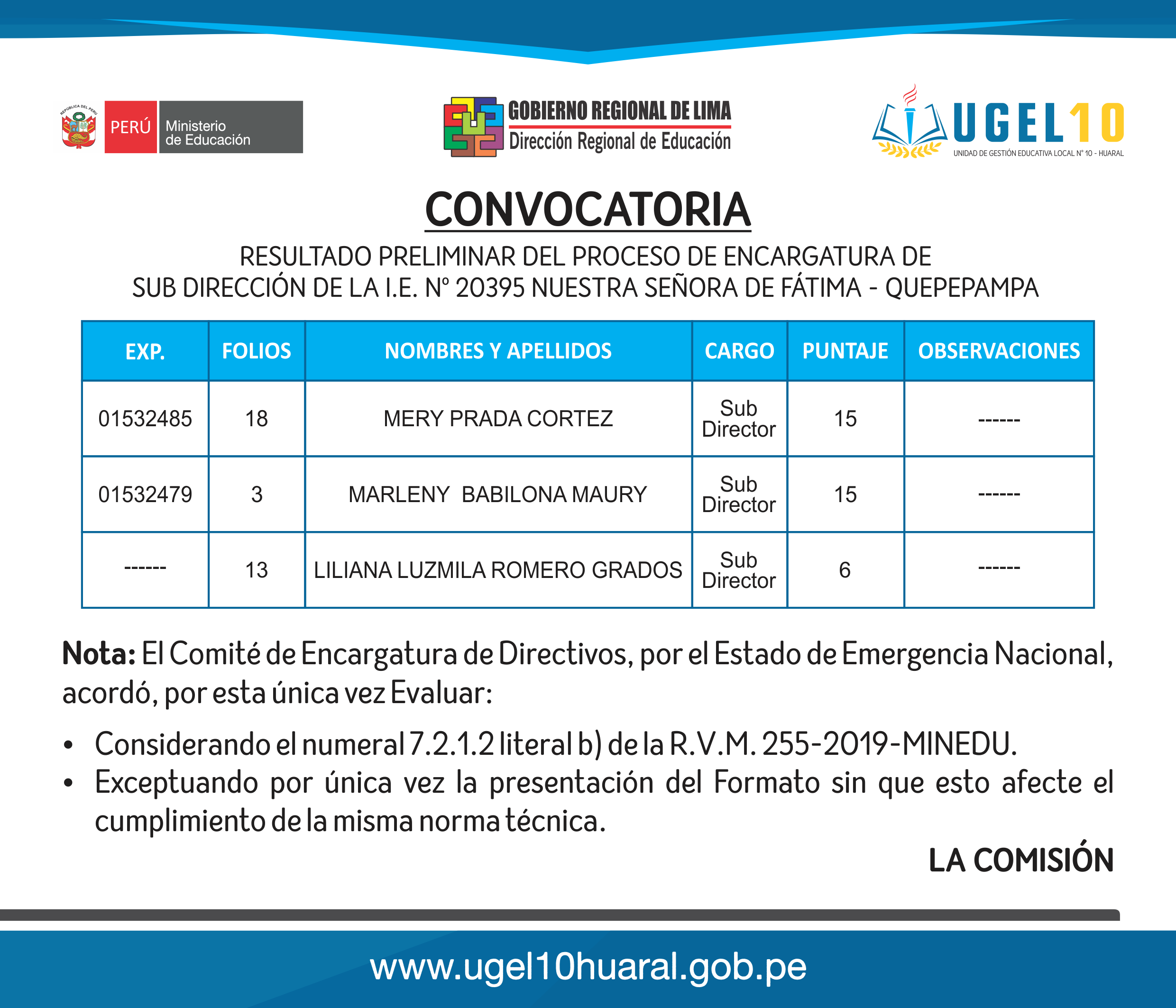 22 Jun,2020 Convocatorias COMMENTS RESULTADO PRELIMINAR DEL PROCESO DE ENCARGATURA DE SUB DIRECCIÓN DE LA I.E. Nº 20395 NUESTRA SEÑORA DE FÁTIMA - QUEPEPAMPA