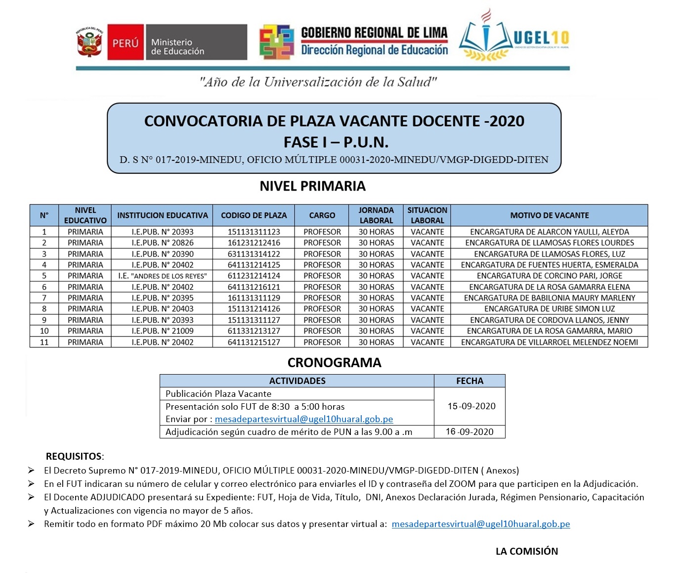 14 Sep,2020 Convocatorias COMMENTS Convocatoria de Plaza Vacante Docente 2020 - Primaria - Fase I - P.U.N.