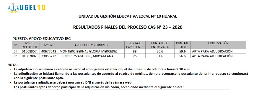 Al momento de ingresar a la adjudicación vía Zoom, cada postulante deberá identificarse con sus nombres y apellidos, asimismo deberá activar su cámara para proceder con la adjudicación correspondiente.