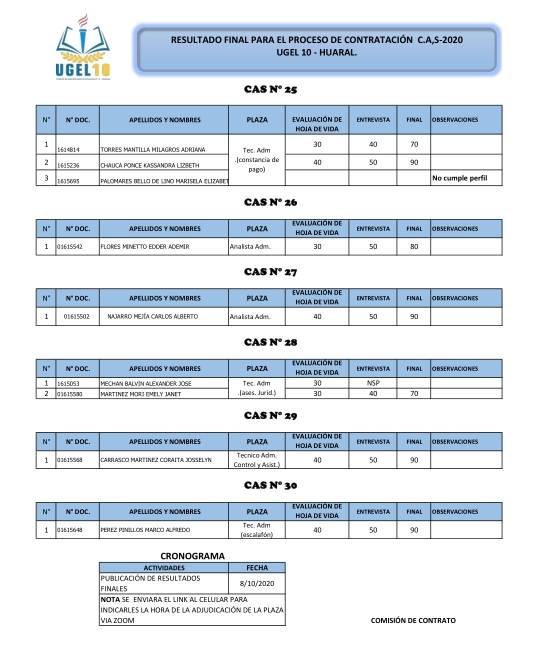 08 Oct,2020 Convocatorias COMMENTS Resultados Finales del Proceso de Contratación CAS 25, 26, 27, 28, 29, 30, 31, 32, 33, 34, 35