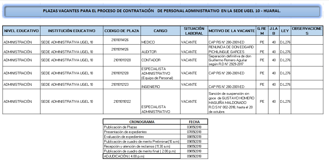 03 May,2018 Convocatorias COMMENTS PLAZAS VACANTES PARA EL PROCESO DE CONTRATACIÓN DE PERSONAL ADMINISTRATIVO EN LA SEDE UGEL 10 - HUARAL.