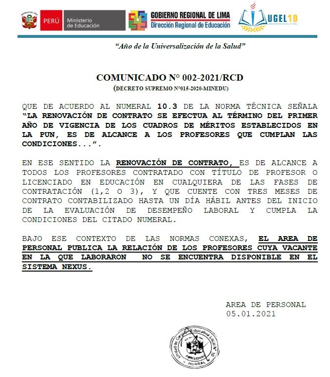 05 Ene,2021 Convocatorias COMMENTS RELACIÓN DE LOS PROFESORES CUYA VACANTE EN LA QUE LABORARON NO SE ENCUENTRA DISPONIBLE EN EL SISTEMA NEXUS ✅RELACIÓN VACANTES NO DISPONIBLES ➡️ https://drive.google.com/file/d/1swo8KQcA6LU3ivIuEu9qddFtV68lXFgd/view?usp=sharing