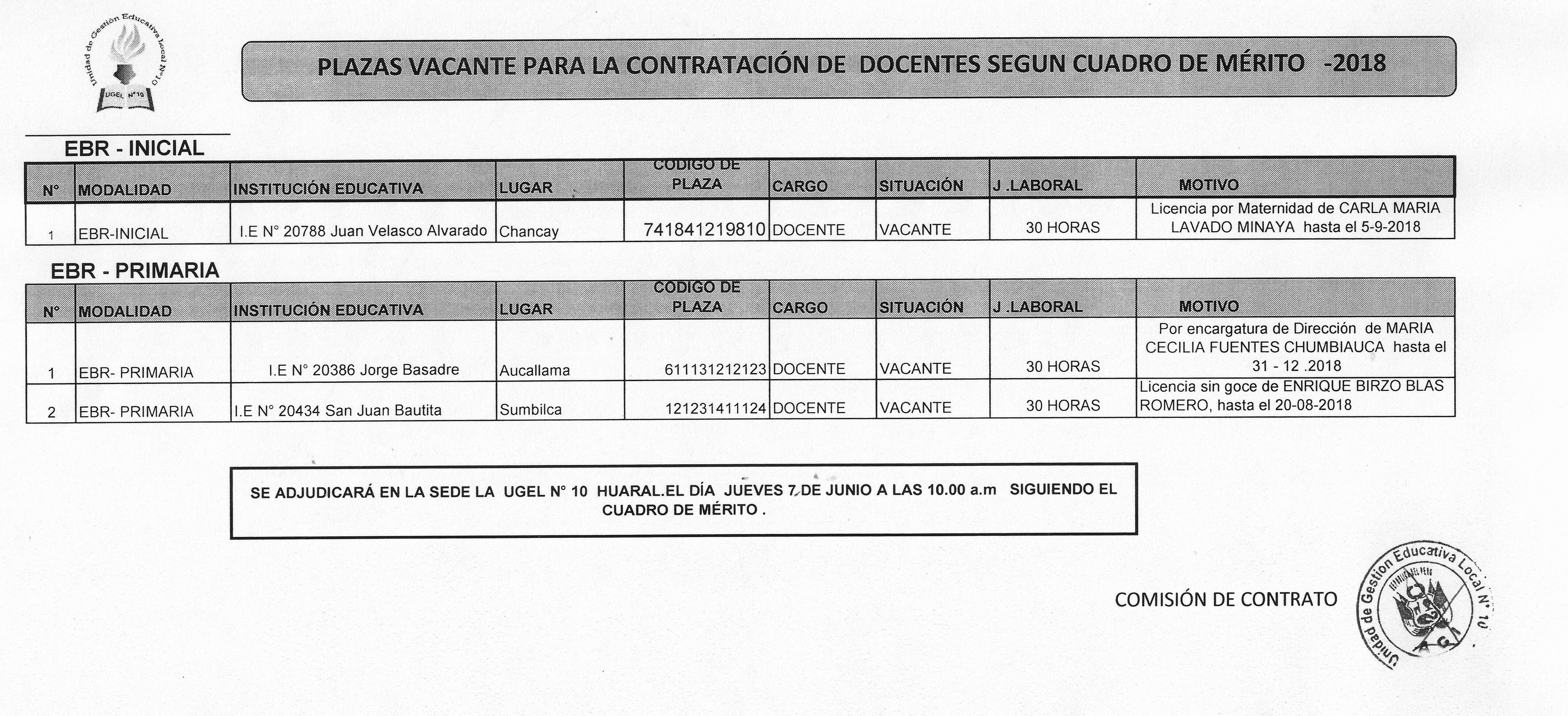 06 Jun,2018 Convocatorias COMMENTS PLAZA VACANTE PARA LA CONTRATACIÓN DE DOCENTES SEGÚN CUADRO DE MERITO-2018
