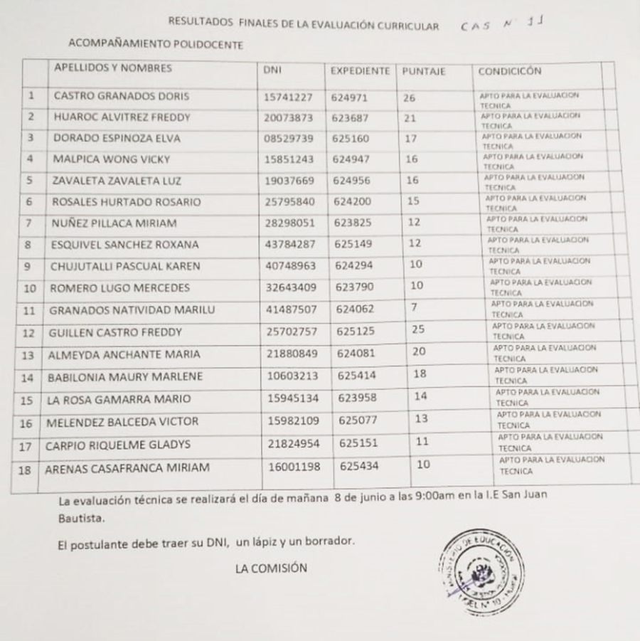08 Jun,2018 Convocatorias COMMENTS CAS N° 11 - Resultados Finales de la Evaluación Curricular Acompañamiento Polidocente