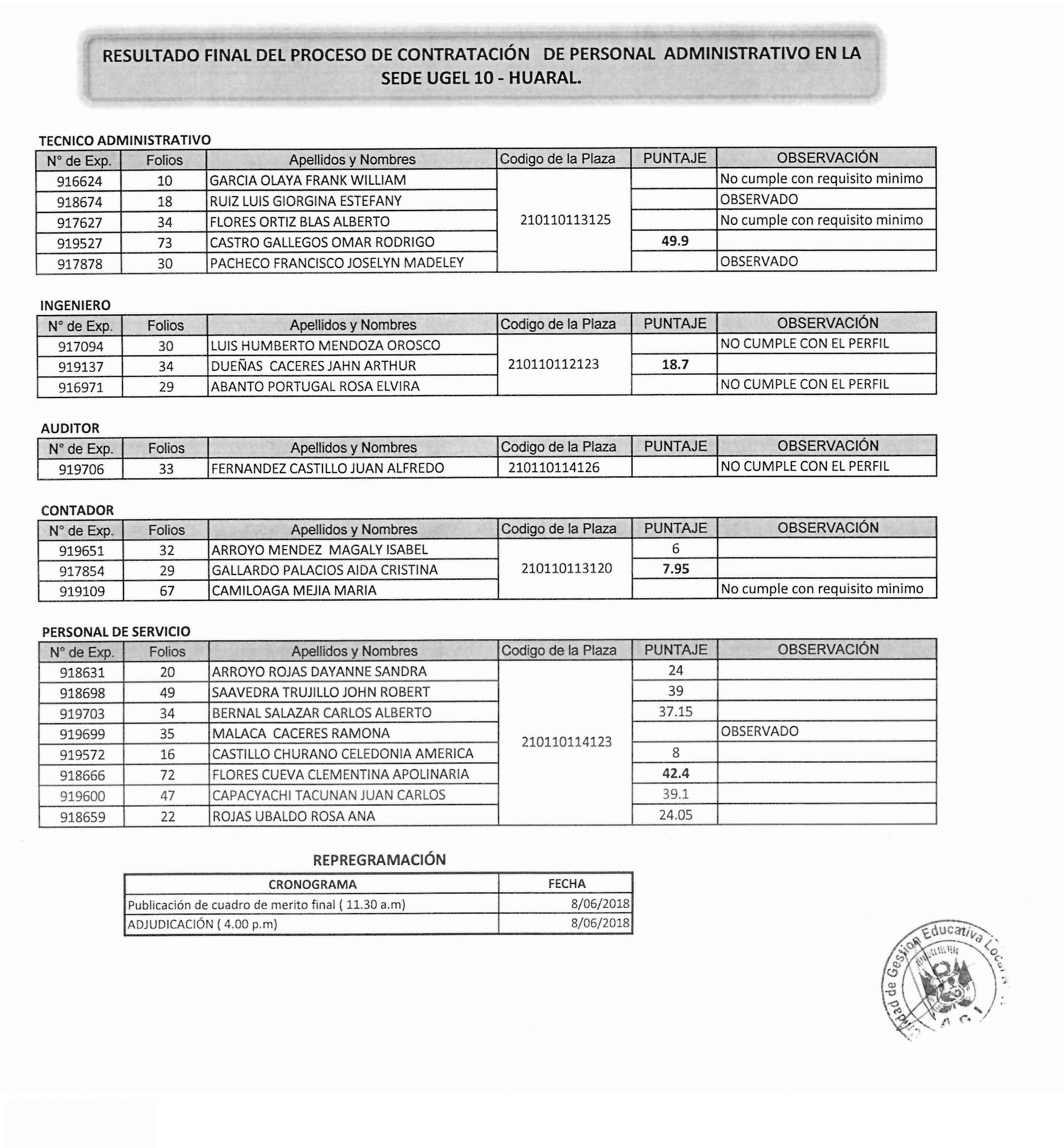 08 Jun,2018 Convocatorias COMMENTS RESULTADO FINAL DEL PROCESO DE CONTRATACIÓN DE PERSONAL ADMINISTRATIVO EN LA SEDE UGEL 10 -HUARAL