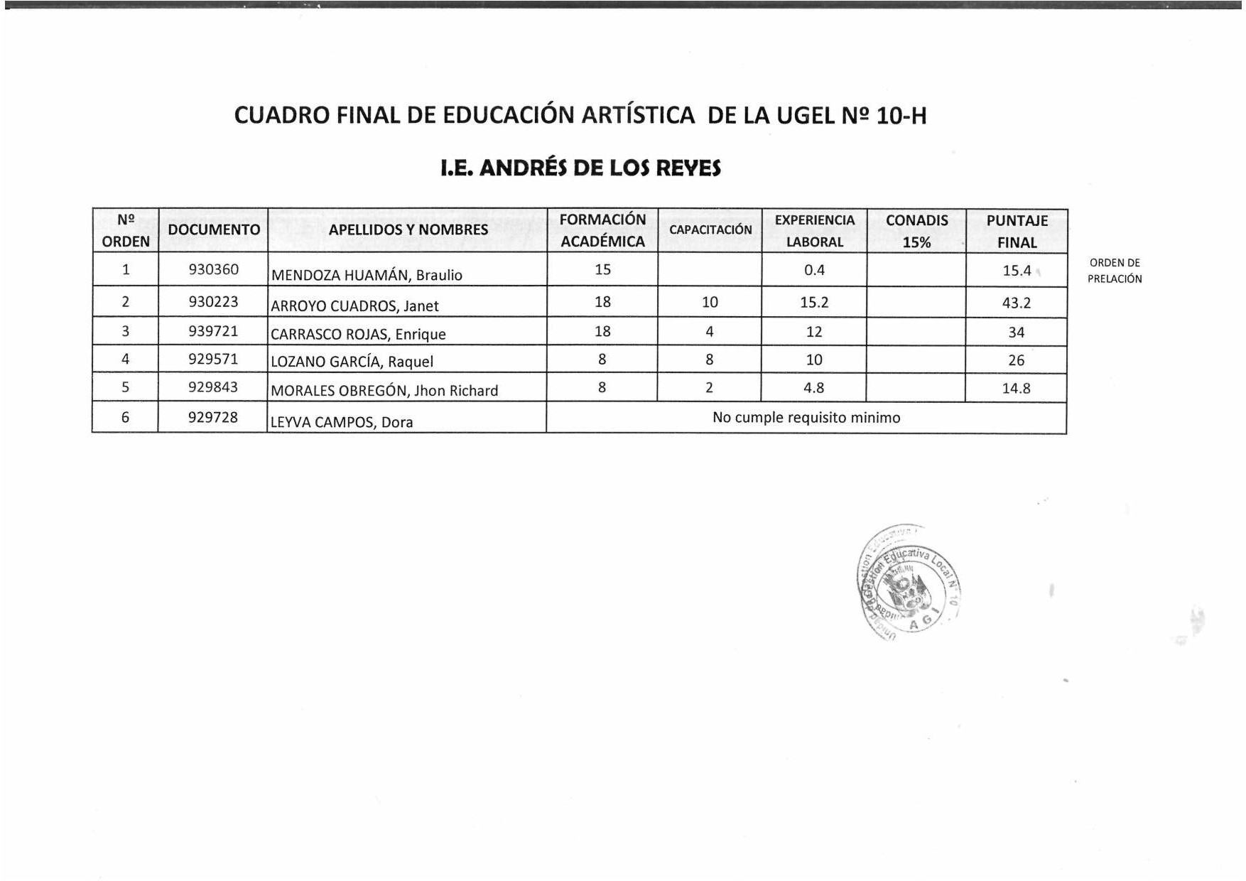 11 Jun,2018 Convocatorias COMMENTS Cuadro Final de Educación Artística de la UGEL N° 10-H [I.E. Andrés de los Reyes]