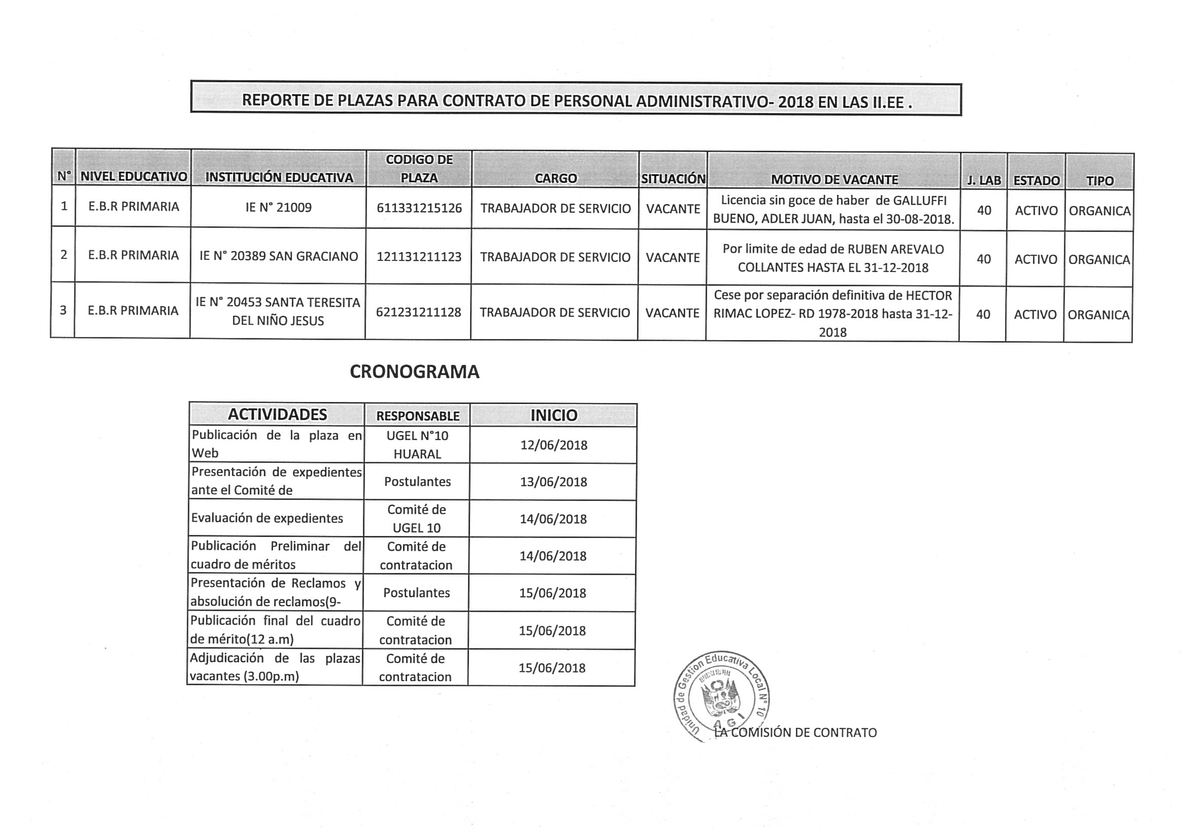 12 Jun,2018 Convocatorias COMMENTS REPORTE DE PLAZAS PARA CONTRATO DE PERSONAL ADMINISTRATIVO-2018 EN LAS II.EE.