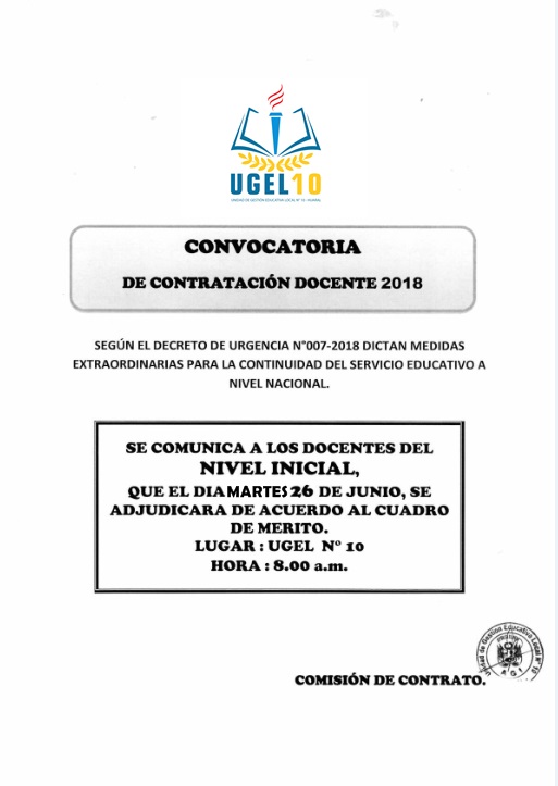 25 Jun,2018 Convocatorias COMMENTS Contratación Docente 2018 - Nivel Inicial - Para la continuidad del servicio educativo a nivel nacional.