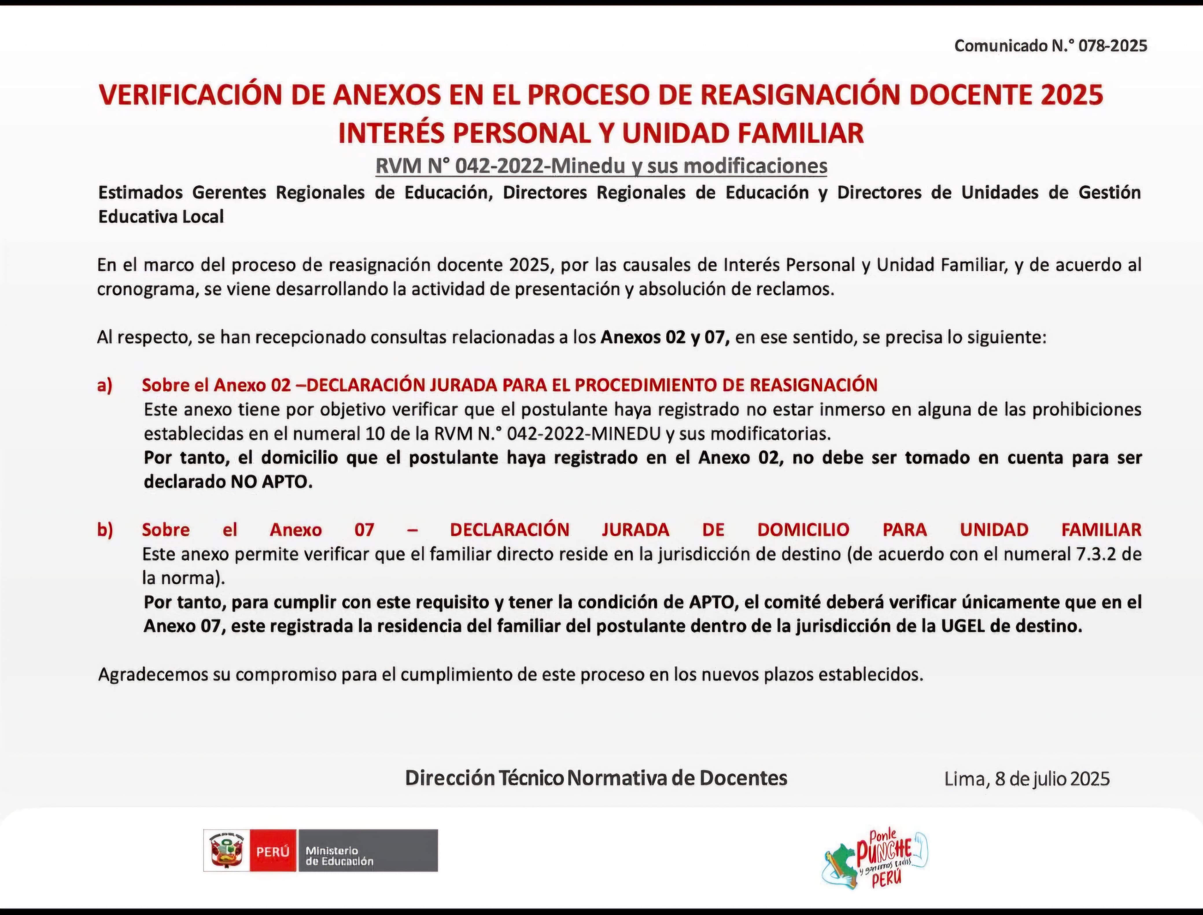 09 Jul,2025 Convocatorias COMMENTS Modificación del cronograma del proceso de reasignación docente por las causales de interés personal y unidad familiar para el año 2025 ✅️ VER COMUNICADO ➡️ https://drive.google.com/file/d/1zvD68K5qbiFboCYM0EpmIOsZ2oIbms7x/view?usp=sharing