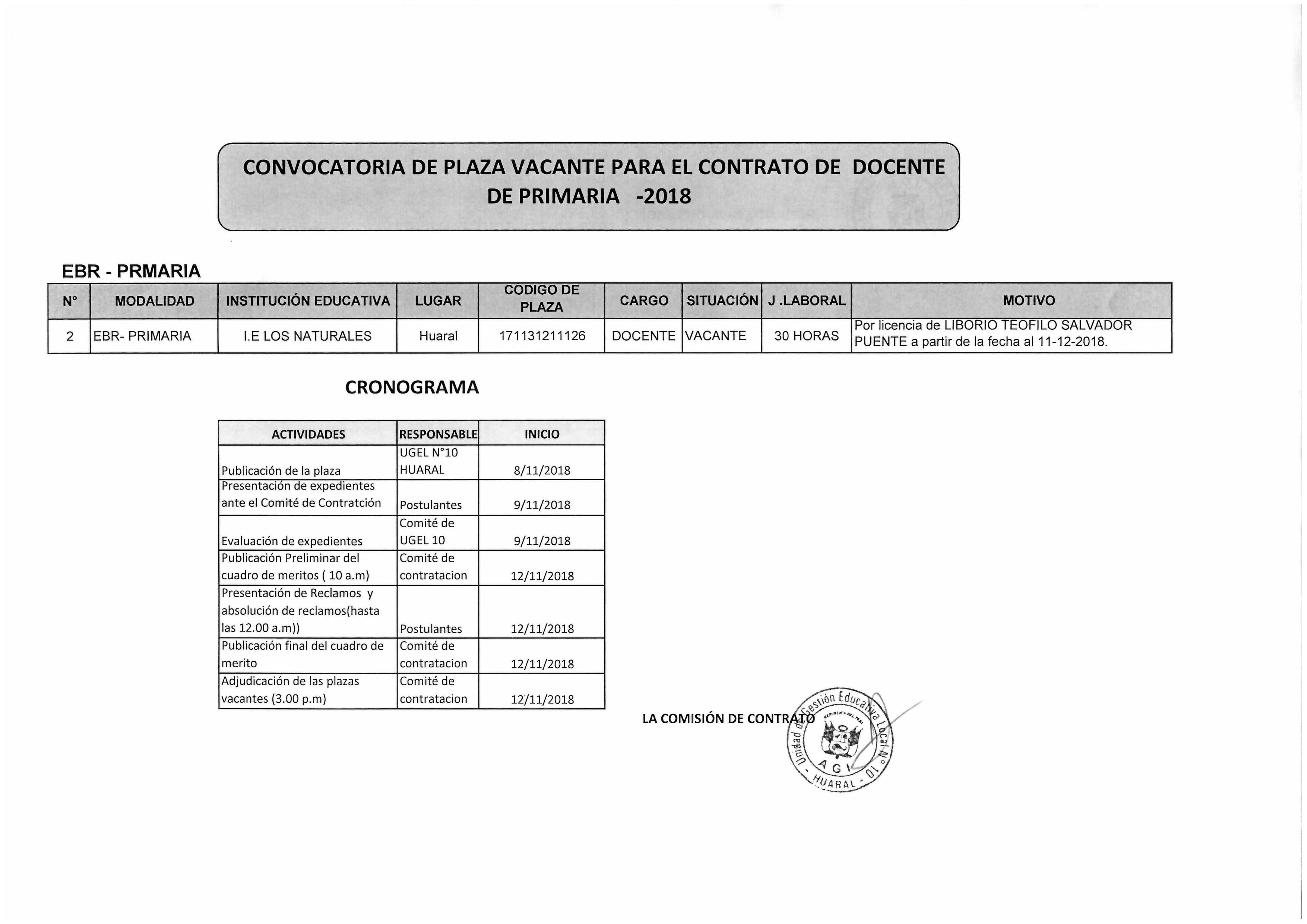 08 Nov,2018 Convocatorias COMMENTS CONVOCATORIA DE PLAZA VACANTE PARA CONTRATO DE DOCENTE DE PRIMARIA - I.E LOS NATURALES