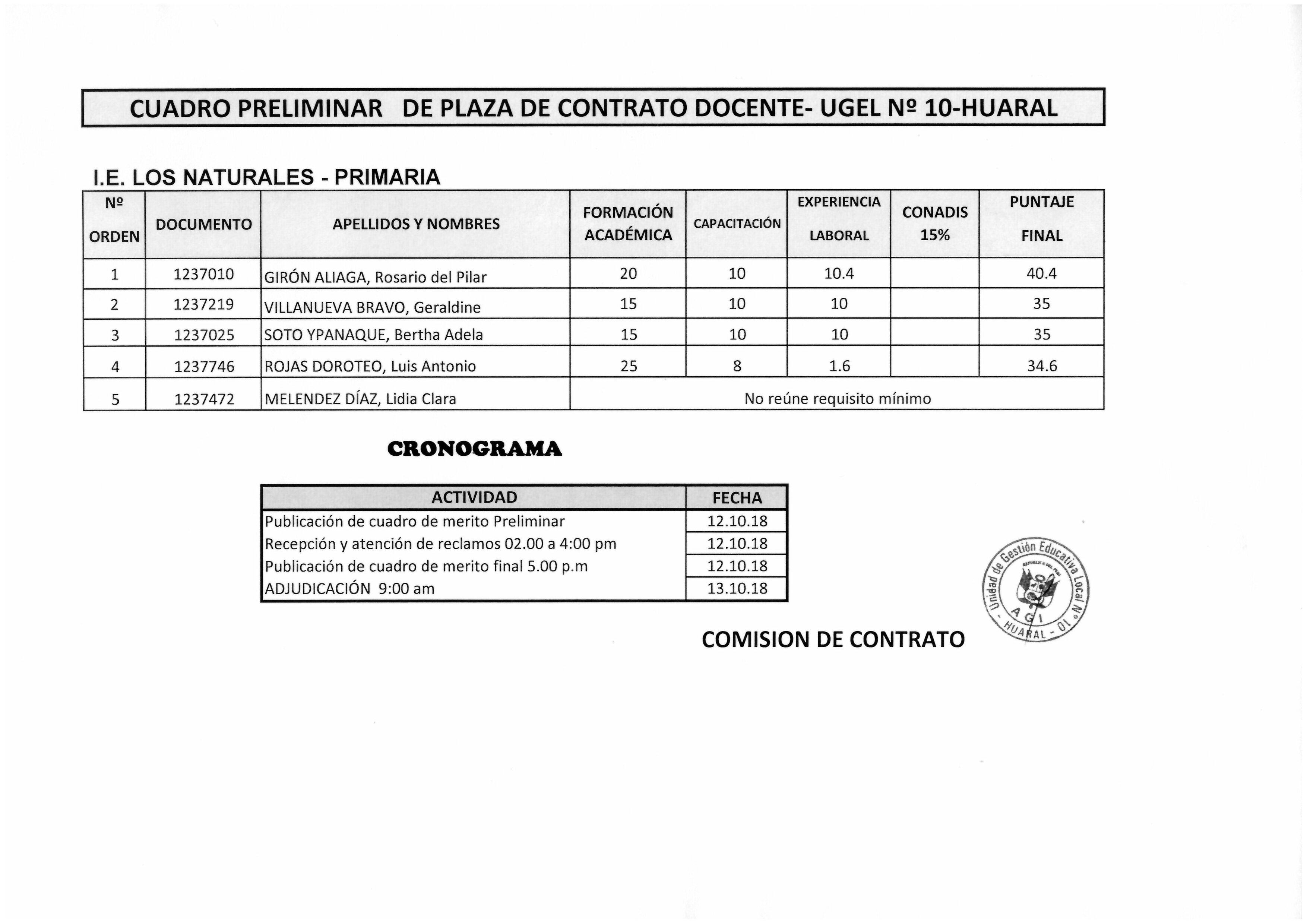 12 Nov,2018 Convocatorias COMMENTS CUADRO PRELIMINAR DE PLAZA DE CONTRATO DOCENTE - I.E LOS NATURALES