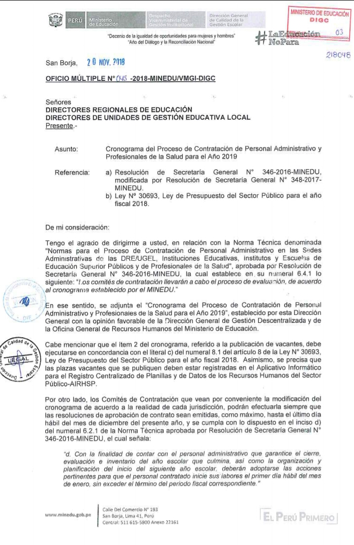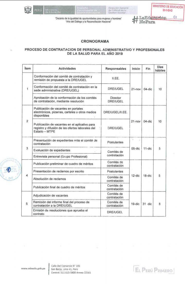 23 Nov,2018 Convocatorias COMMENTS Cronograma del Proceso de Contratación de Personal Administrativo y Profesionales de la Salud para el Año 2019. ver RSG N° 346-2016-MINEDU ver RSG N° 348-2017-MINEDU (Modifica RSG N° 346-2016-minedu)