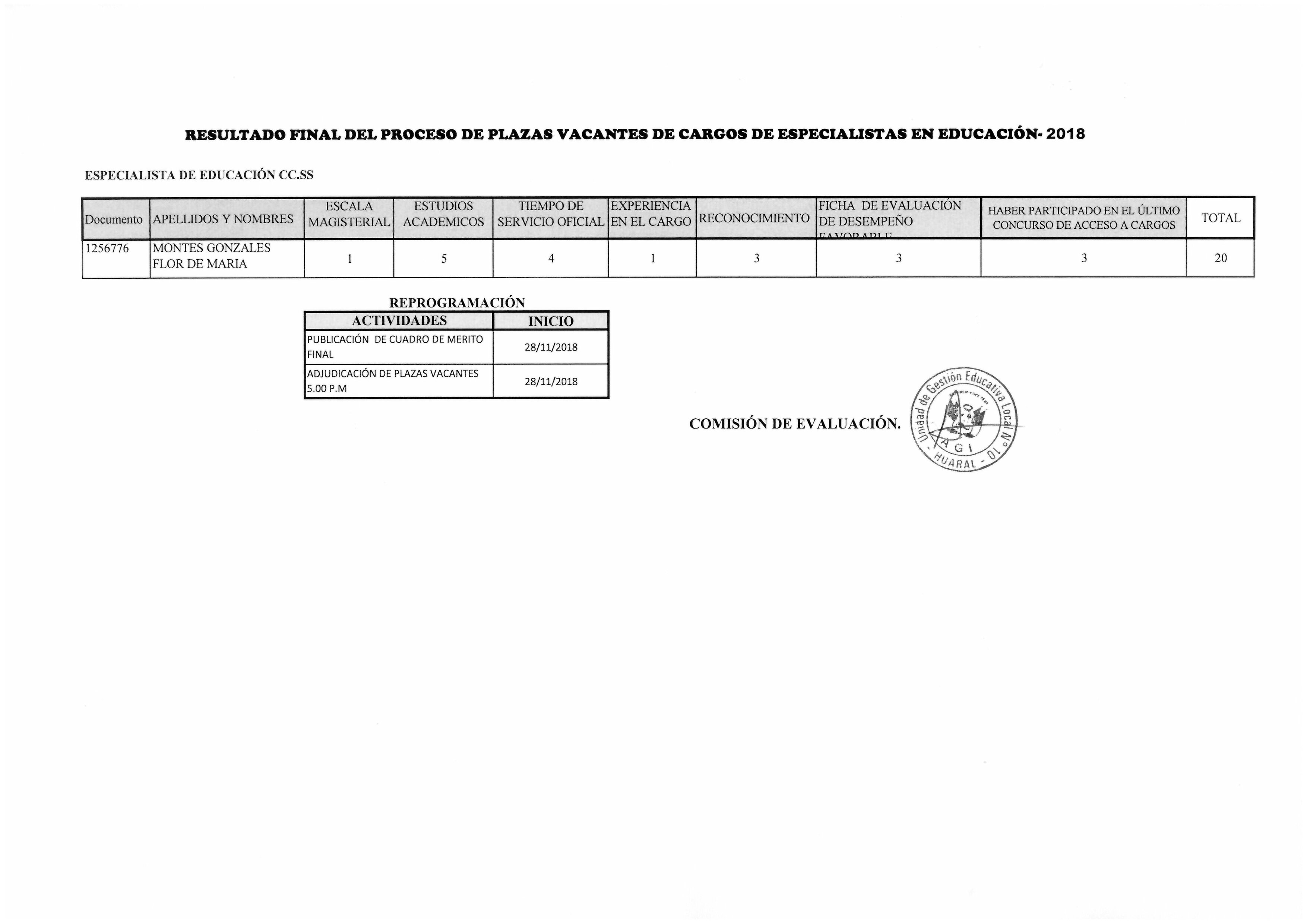 28 Nov,2018 Convocatorias COMMENTS RESULTADO FINAL DEL PROCESO DE PLAZAS VACANTES DE CARGOS DE ESPECIALISTAS EN EDUCACIÓN-2018