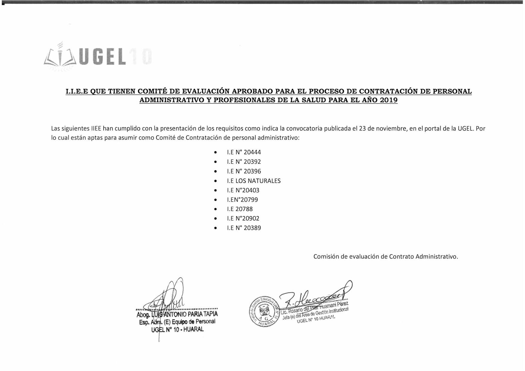 03 Dic,2018 Convocatorias COMMENTS I.I.E.E QUE TIENEN COMITE DE EVALUACION APROBADO PARA EL PROCESO DE CONTRATACION DE PERSONAL ADMINISTRATIVO Y PROFESIONALES DE LA SALUD PARA EL AÑO 2019 VER PLAZAS.E.