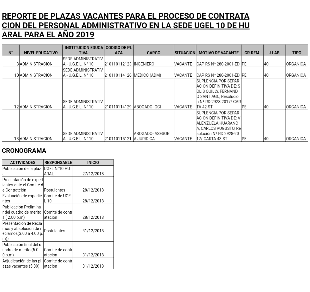 27 Dic,2018 Convocatorias COMMENTS Plazas vacantes para el Proceso de Contratación del Personal Administrativo en la Sede UGEL 10