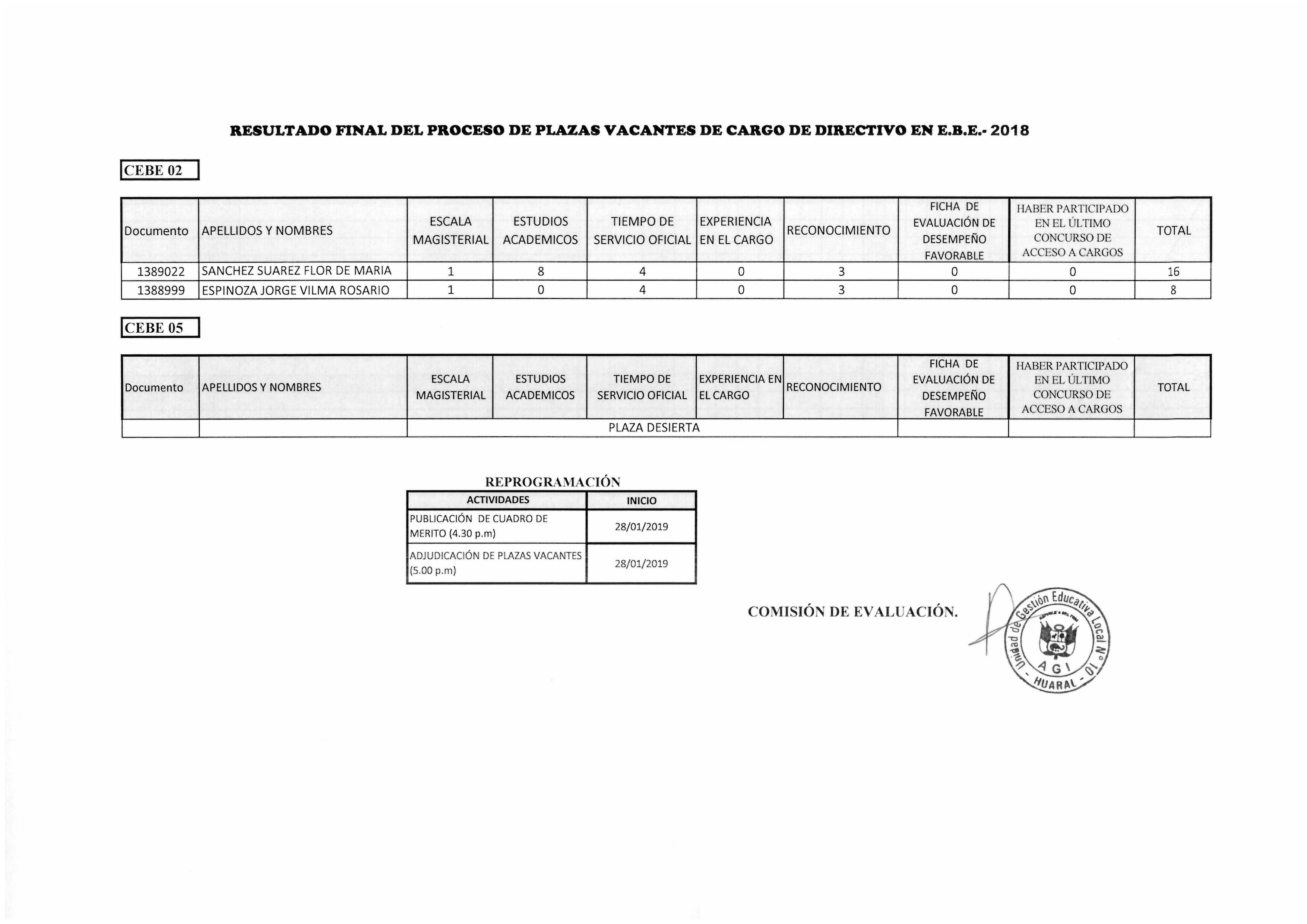 28 Ene,2019 Convocatorias COMMENTS RESULTADO FINAL DEL PROCESO DE PLAZAS VACANTES DE CARGO DE DIRECTIVO EN E.B.E.-2018