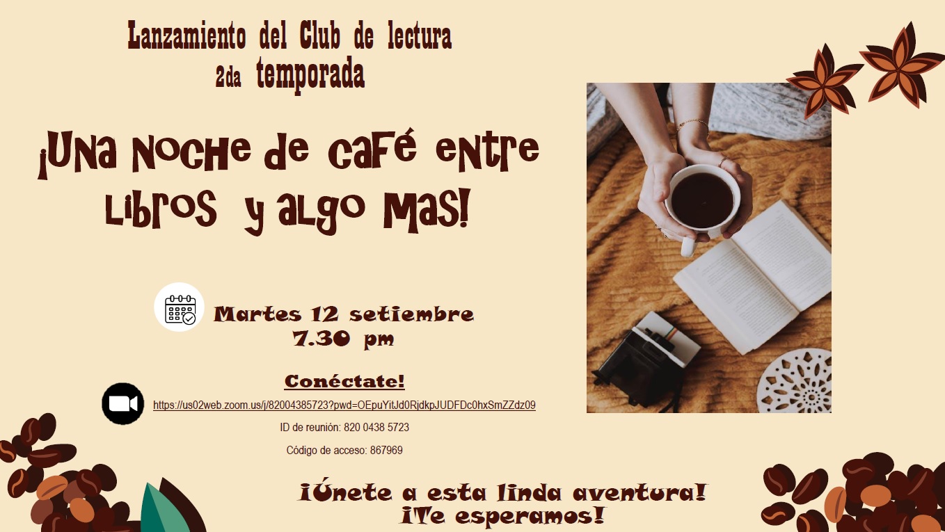 Eventos y Capacitaciones 11 Sep,2023 Eventos y Capacitaciones COMMENTS LANZAMIENTO DEL CLUB DE LECTURA - SEGUNDA TEMPORADA ✅️INGRESAR ZOOM ➡️ https://us02web.zoom.us/j/82004385723?pwd=OEpuYitJd0RjdkpJUDFDc0hxSmZZdz09