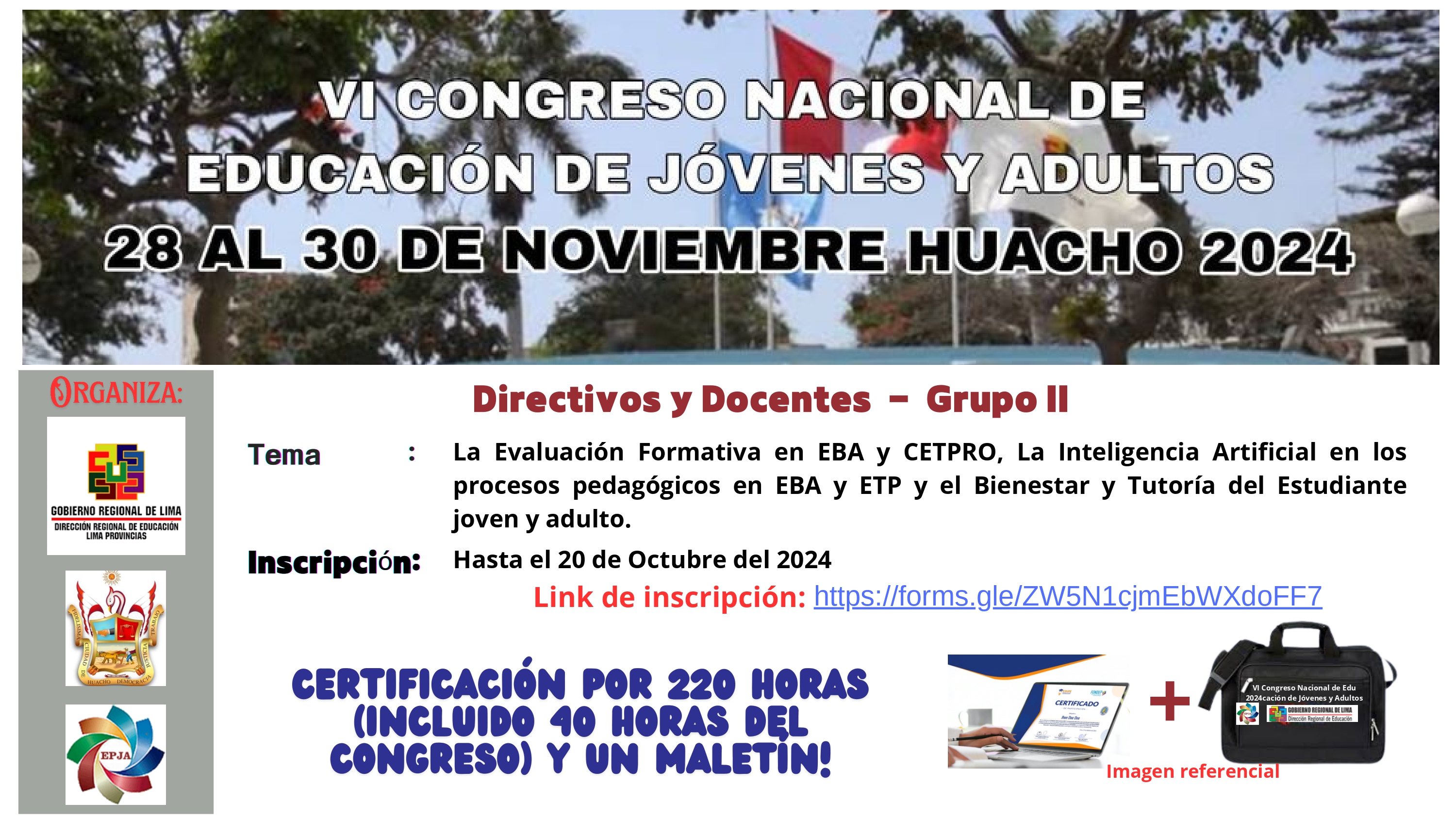 Dirigido a directivos y docentes del Grupo II. Participa en este importante evento donde se abordarán temas cruciales como la Evaluación Formativa en EBA y CETPRO, el uso de la Inteligencia Artificial en procesos pedagógicos, el Bienestar y Tutoría de estudiantes jóvenes y adultos.