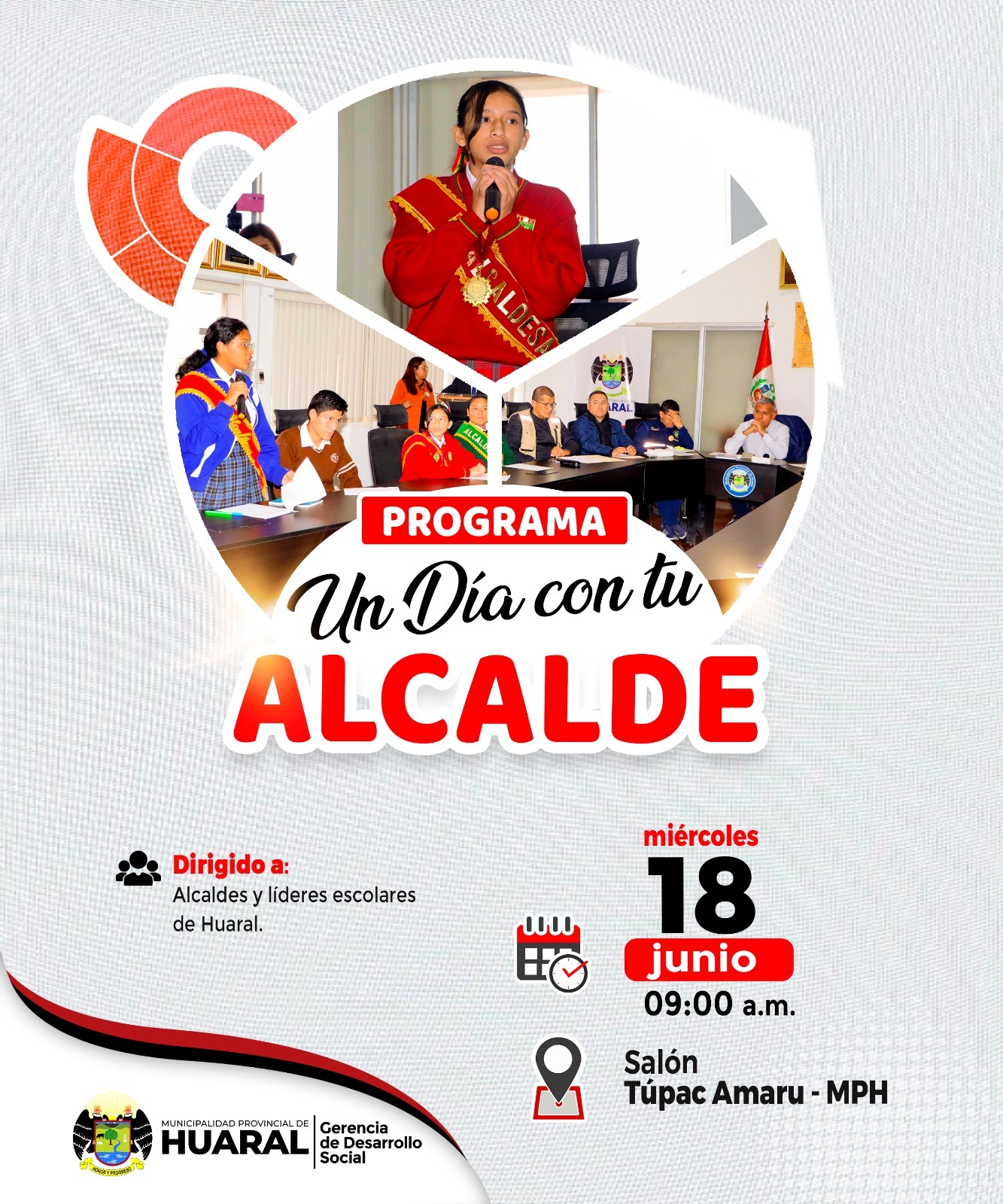 Eventos y Capacitaciones 17 Jun,2025 Eventos y Capacitaciones COMMENTS Programa "Un Día con tu Alcalde" Dirigido a alcaldes y líderes escolares de Huaral - 18 de junio - 09:00 a.m. - En el Salón Tupac Amaru de la MPH Juntos construimos un mejor futuro.