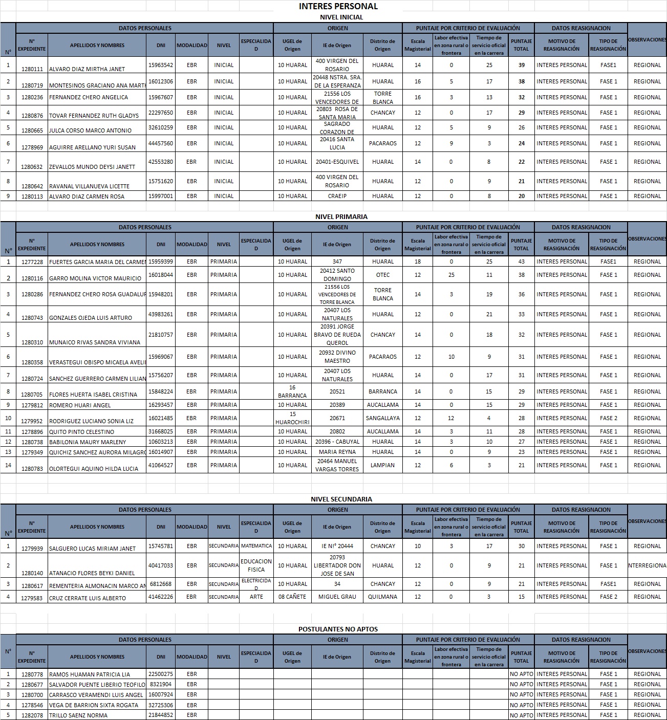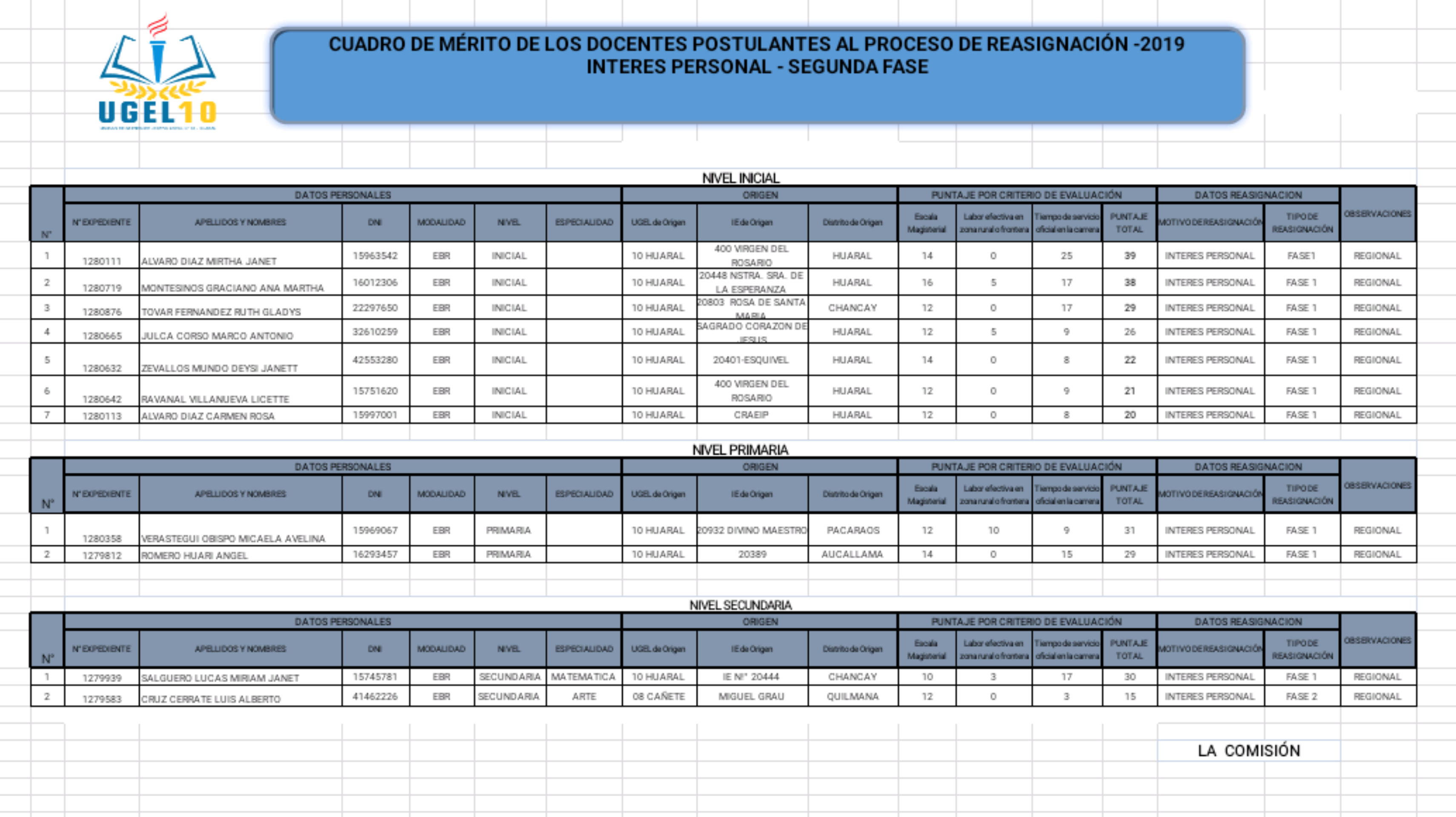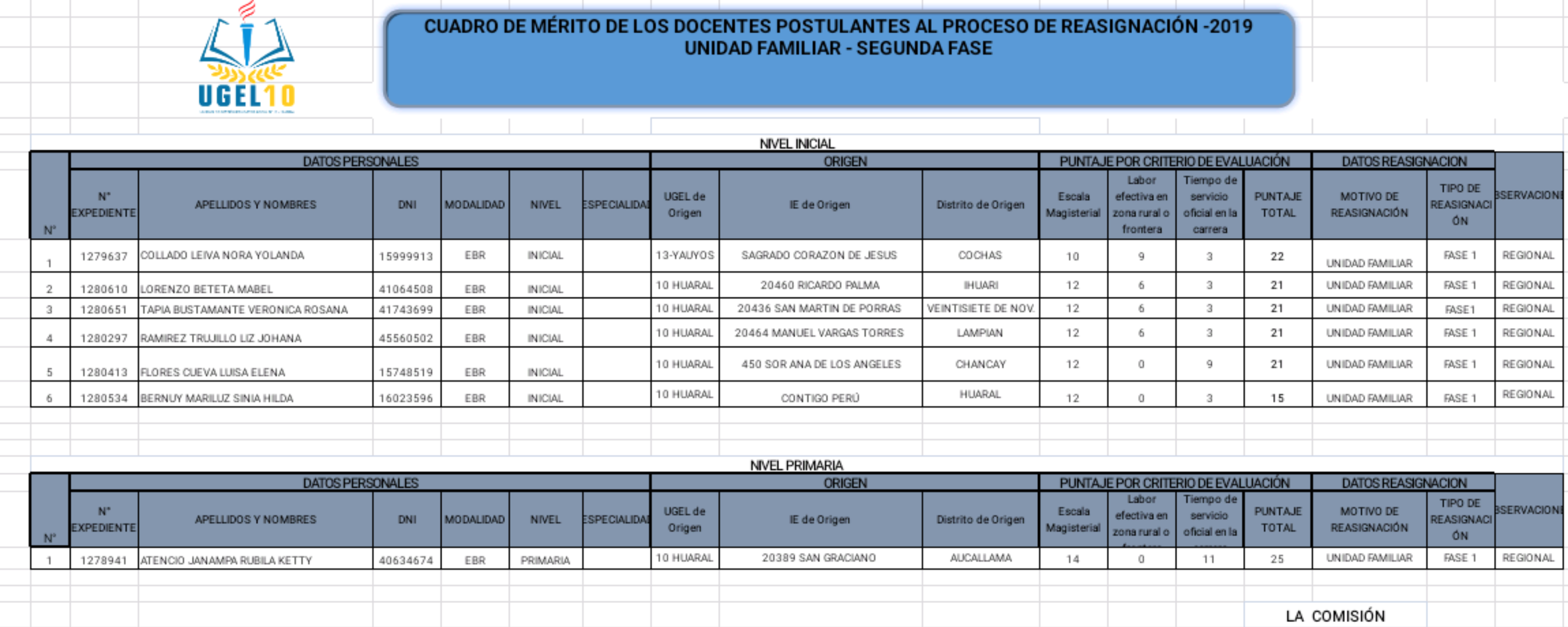 Continuando con la fase 2 del proceso de reasignación docente 2019, la Ugel 10 publica los cuadros de méritos de reasignación por unidad familiar e interes personal.